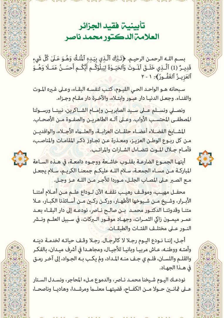 محفل مهيب وموقف رهيب نقف الآن لوداع علم من أعلام أمتنا الأبرار، وشيخ من شيوخها الأطهار، وركن من أركان أساتذتنا الكبار، علا مرتنا وأوقدنا الدكتور محمد بن صالح ناصر، نودعه إلى دار البقاء بعد عمر مسنون زاك الثمرات، وجهاد موفور البركات، في سبيل العلم ونشر النور على مختلف الفئات والطبقات.