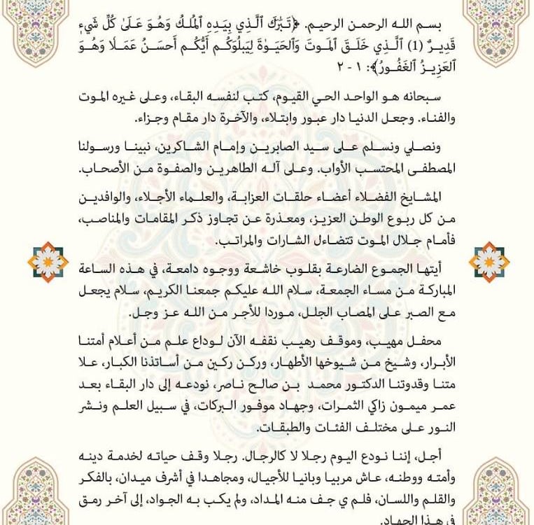 لقد هالهم اليوم وقع الفاجعة حين بلغهم نبأ رحيل الدليل الحادي، وأفول شمس طالما أشرقت على كل ربع ووادي، فما كان لهم من عزاء غير حسن ظنهم بالله الكريم أن يبوئكم منازل الصفوة من عباده المكرمين، فما حرمكم عطاء وأسبغتم من جميل، على امتداد عمر مبارك لم يقض بالسنين، بل بآثاره وسعة فضله في العالمين.